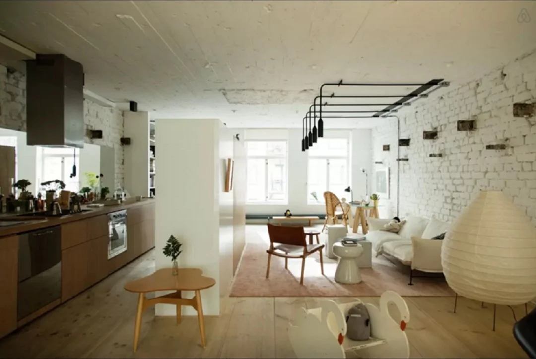 Vaikka asunnon katto näyttäisi olevan suhteellisen alhaalla, tässä asunnossa on vahvasti loft-henkeä, jota korostaa tiiliseinän lisäksi rosoinen katto. Utuisessa tunnelmassa on myös jotain japanilaista. Erityismaininta kauniista vaaleasta lattiasta.